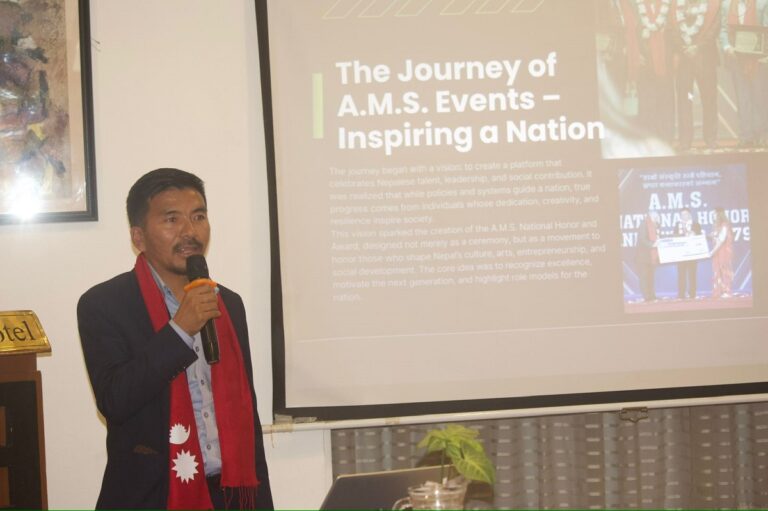 एएमएस ग्लोबल हिमालय फाउन्डेसनले आगामी मे २९ मा काठमाडौंमा आयोजना गर्न लागेको एभरेष्ट टुरिज्म एवार्ड र वल्ड पिस समिटका बारेमा उद्यमी, व्यवसायी जानकारी दिन यहाँ आयोजित कार्यक्रममा उनले पर्यटन क्षेत्रमा लगानी बढाउन पनि यस किसिमका कार्यक्रमहरुको आयोजना गर्नु आवश्यक रहेको बताए ।